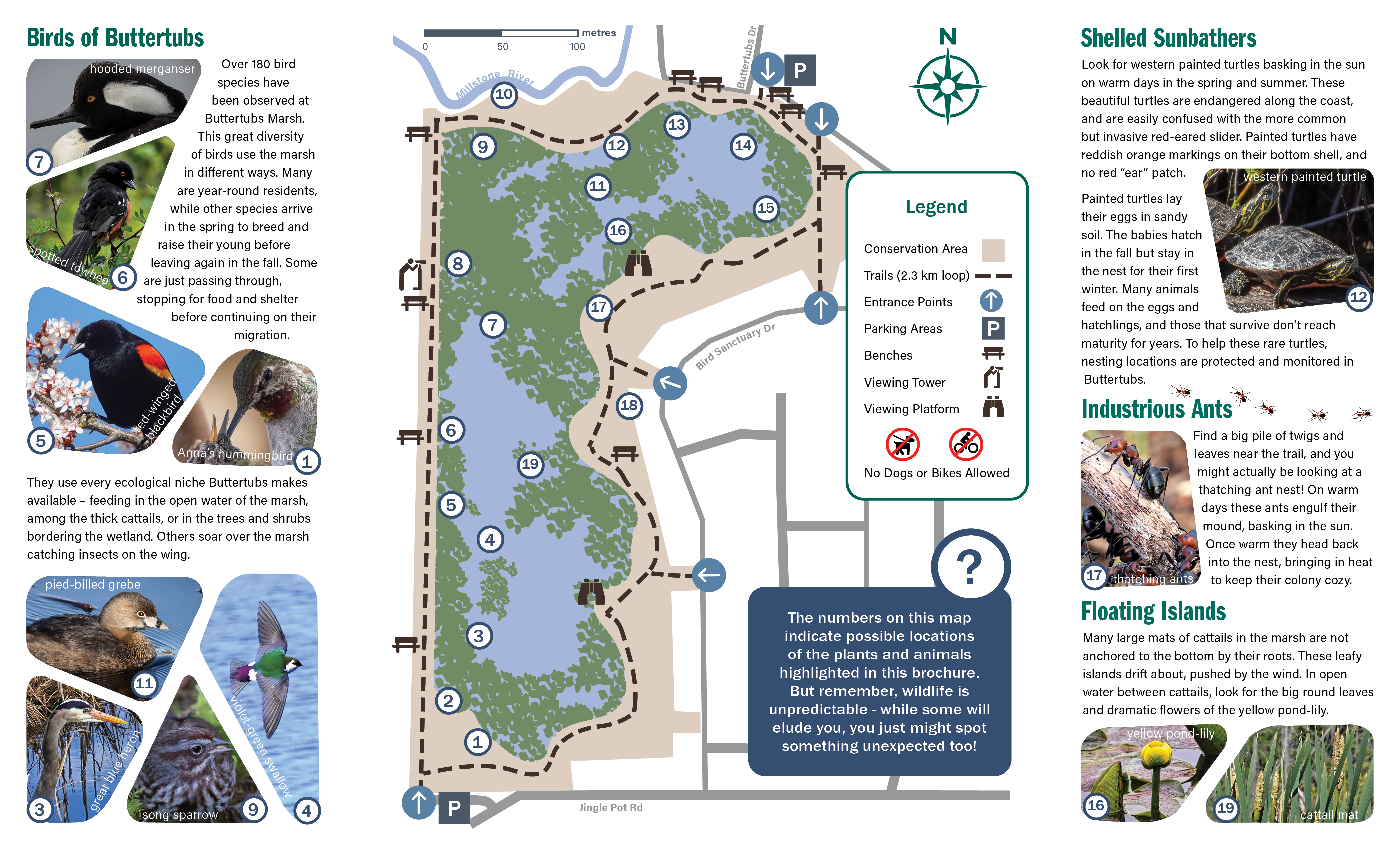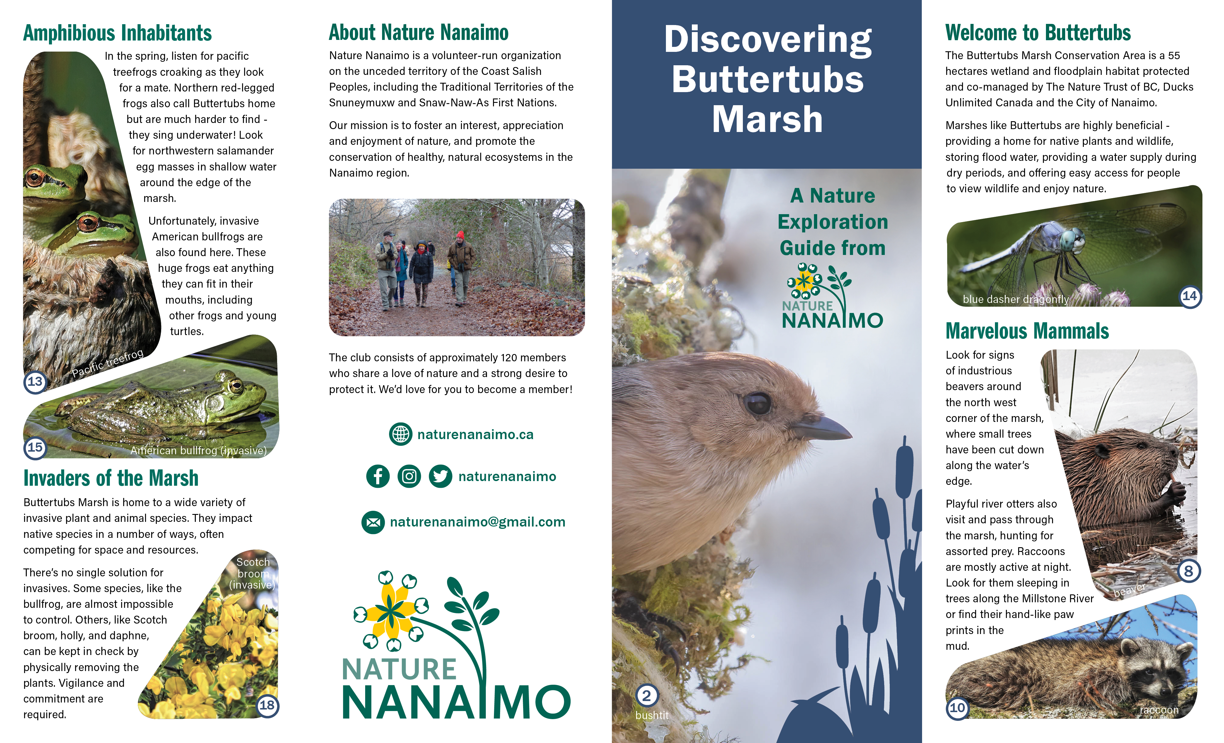 Educational four-fold brochure to promote self-guided walks in a nature-rich protected wetland and public park for Nature Nanaimo. Conducted all manners of material development; research, copywriting, image selection, and graphic design, including map illustration.